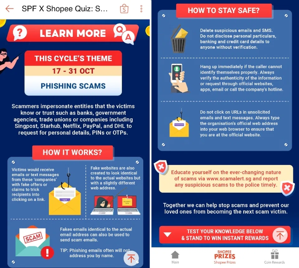 In the game, shoppers answer questions on a variety of common scams in Singapore and are rewarded with Shopee coins, vouchers and other prizes.