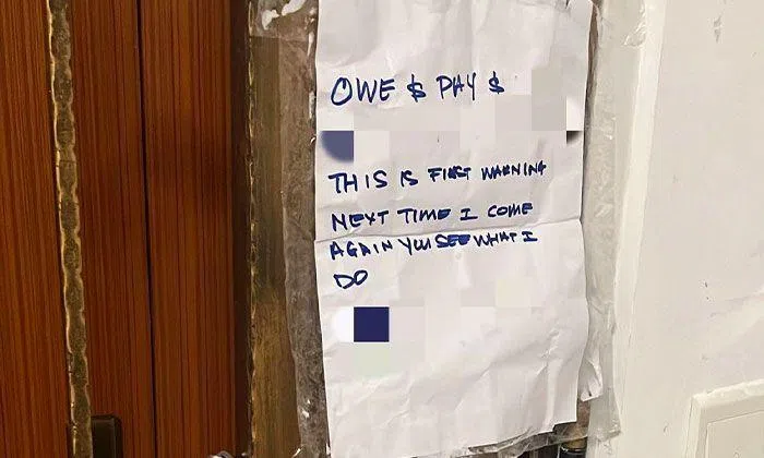 The note reads: "Owe $ pay $. This is first warning. Next time I come again you see what I do (sic)."