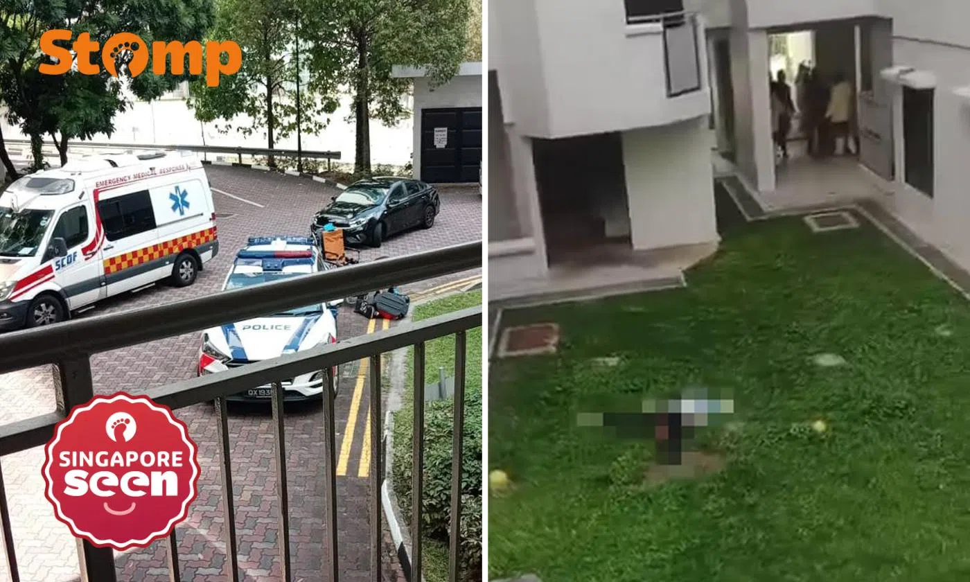 Videos show the woman lying on a grass patch beneath the block. A small crowd of onlookers can be seen at the void deck.