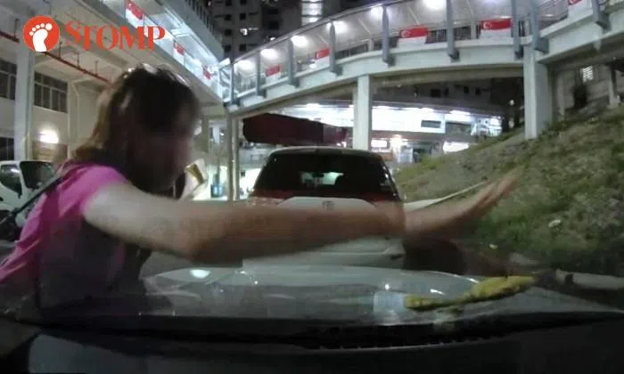 A woman was caught on camera angrily smashing a banana on the windshield of a parked car in Chinatown on the evening of Aug 12.
