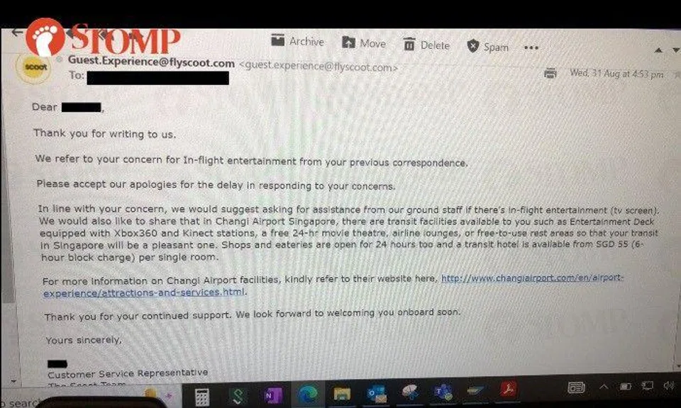 The Stomper shared a photo of the e-mailed reply from Scoot, which said in part: "In line with your concern, we would suggest asking for assistance from our ground staff if there's in-flight entertainment (TV screen)"