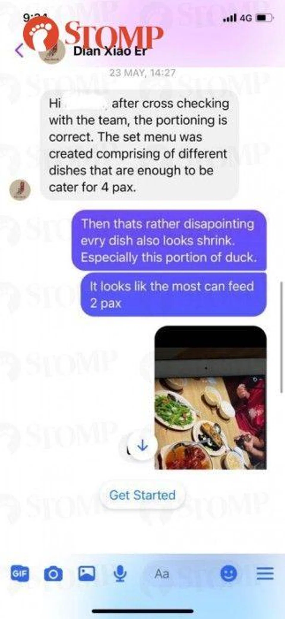 Stomper P said she ordered a takeaway Signature Set for four people from Dian Xiao Er at Punggol Waterway on May 22, at around 6.23pm.