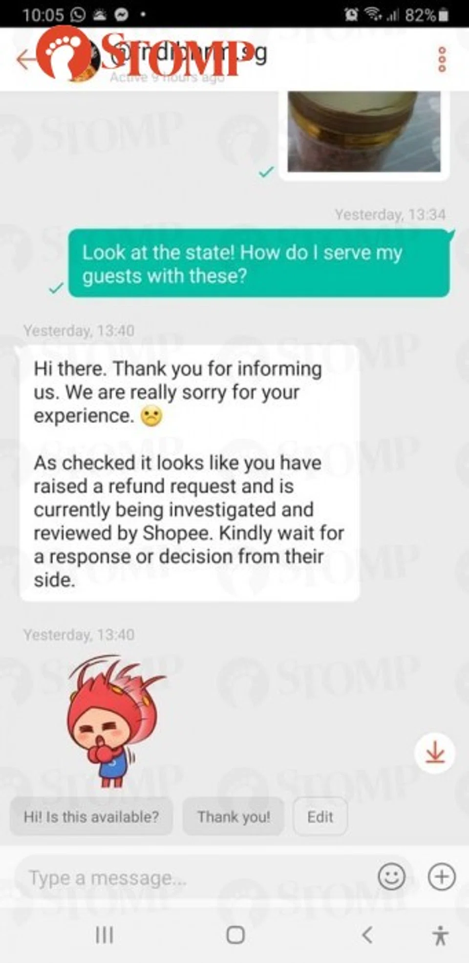 Sherly alerted both Shopee and the seller to the state of the cookies and received an apology from the seller.