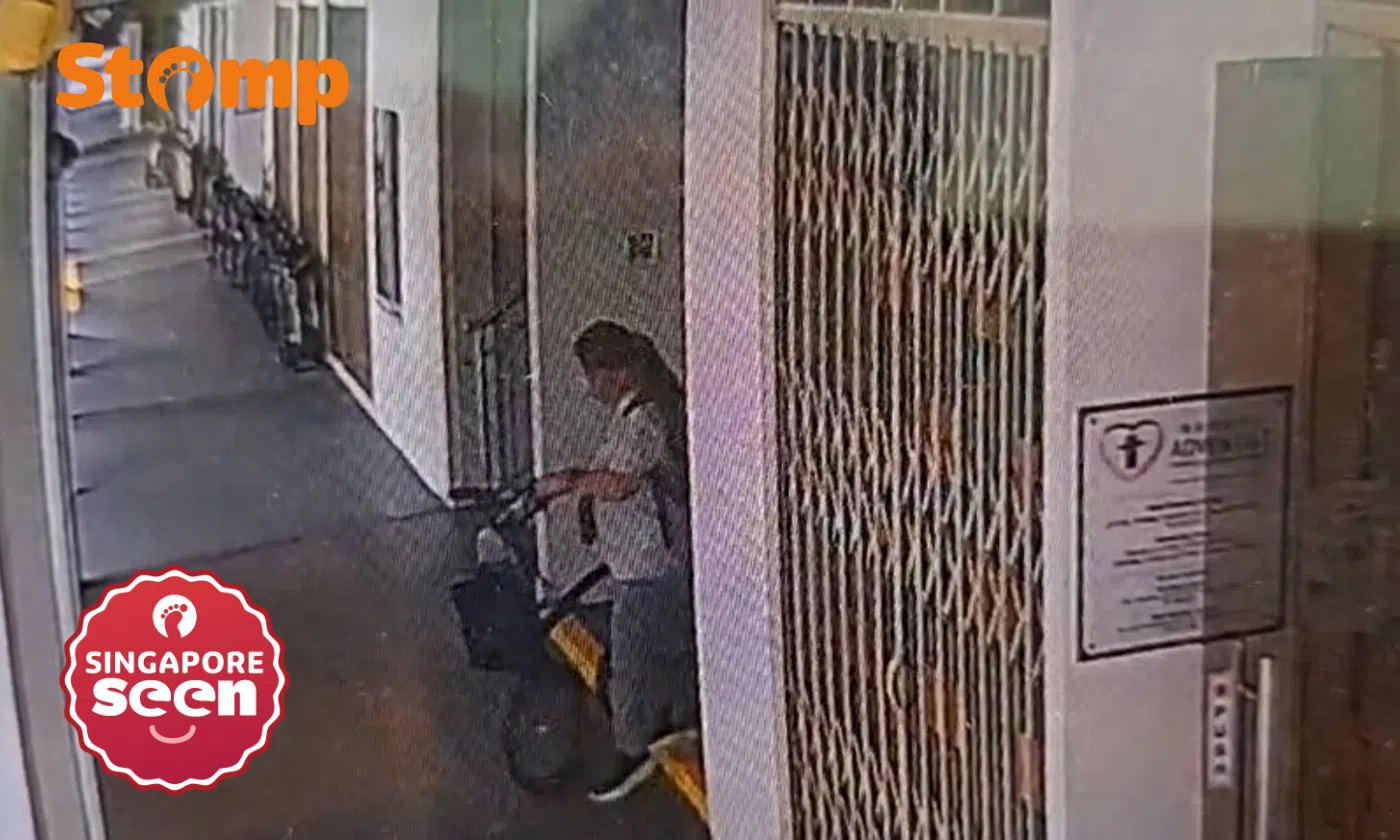 Stomper Ler shared CCTV footage showing the woman pushing the bicycle out of the void deck.