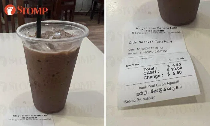 Stomper Tan was shocked to be charged $4.50 for the cold beverage at Kings Indian Banana Leaf Restaurant, located at The Rail Mall in Bukit Timah, on New Year's Day (Jan 1).