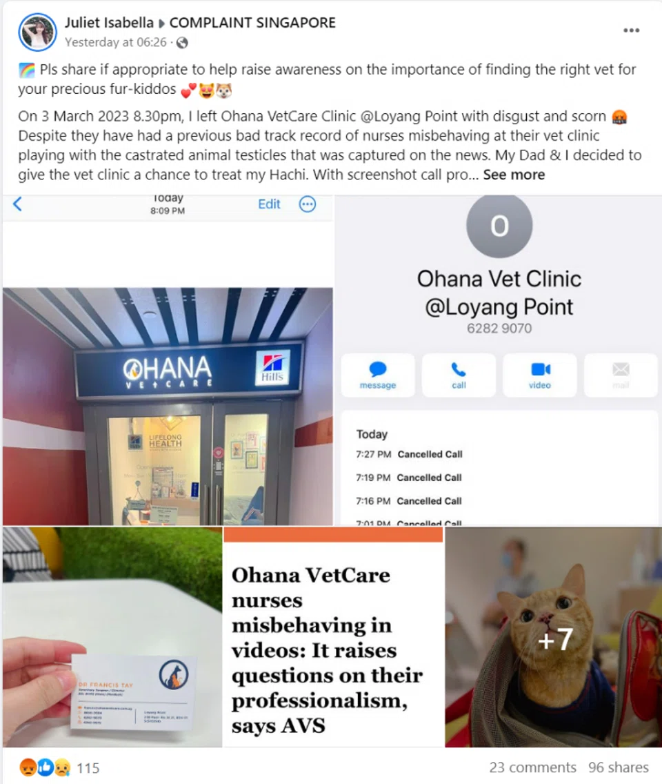 Responding to TNP's queries about the Facebook post, Ohana VetCare said it "does not feel the need to clarify or elaborate on the matter".