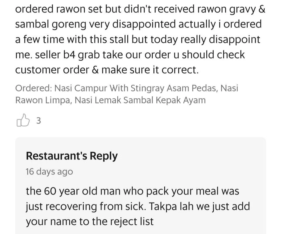 Operating a food stall is not easy but do you think the eatery should have responded to their customers in this way?