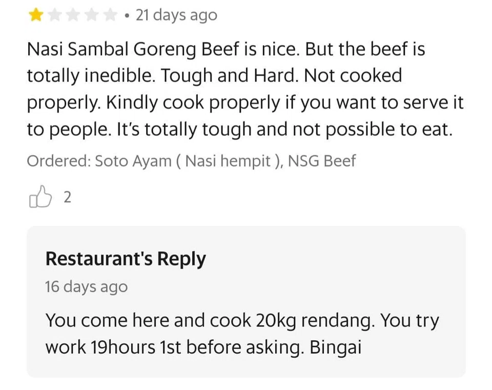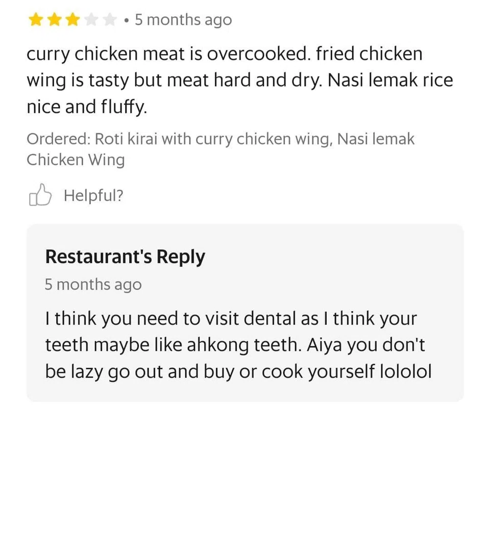 The stall appeared consistent in giving sassy replies to reviews complaining about the quality of the food.