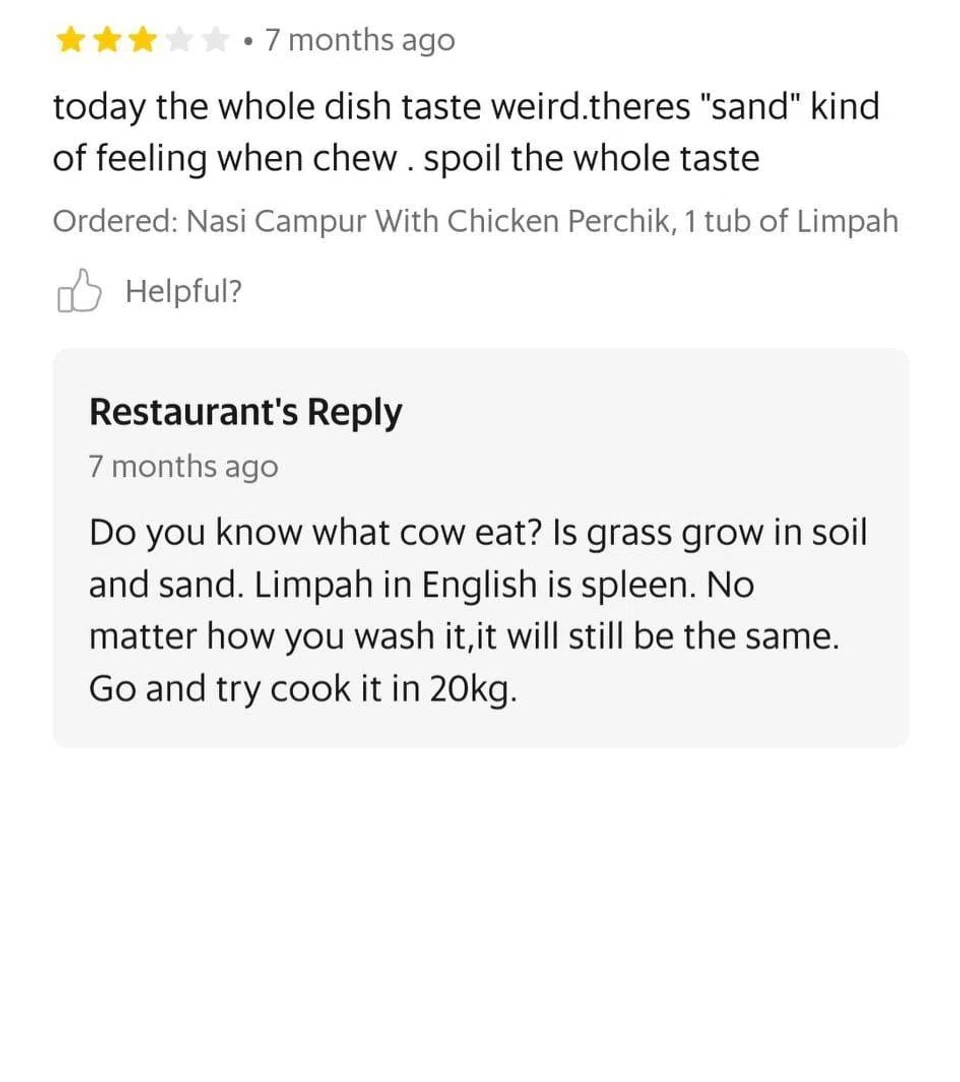 Woman compiles food stall's epic replies to reviews on GrabFood: 'I think you never brush teeth LOL'