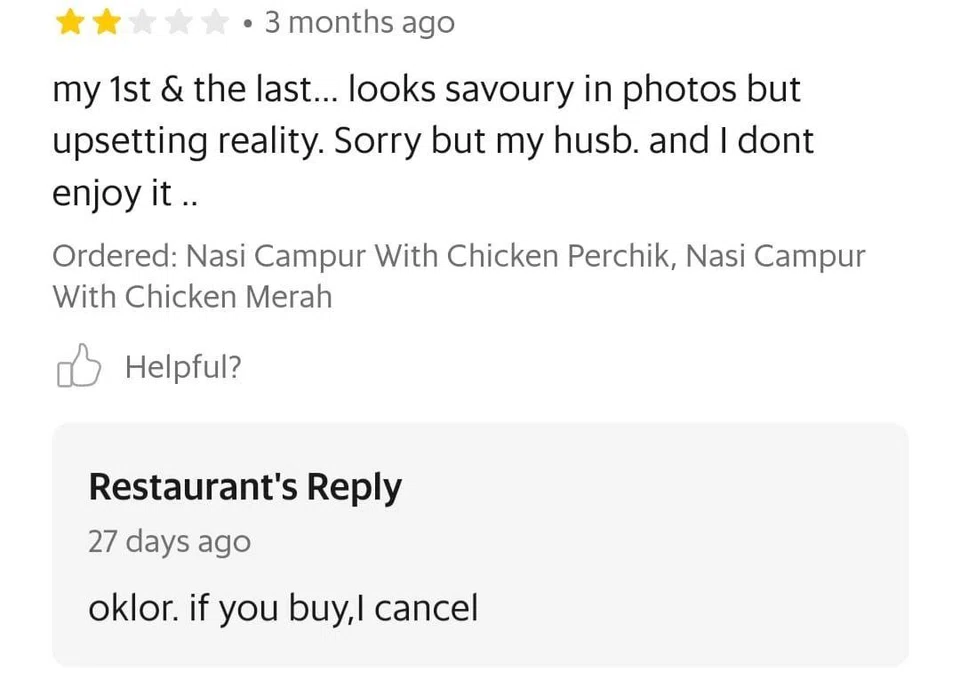 Facebook user Nur Hidayu shared screenshots of one eatery's epic replies to negative reviews on the GrabFood app.