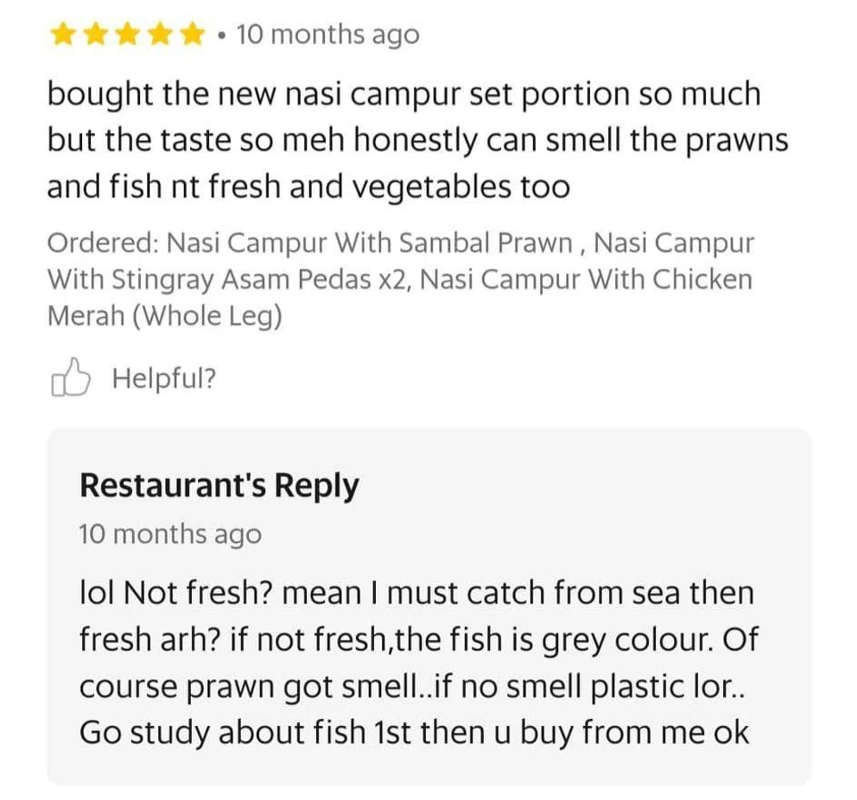 One reviewer complained that their prawns and fish were 'not fresh' to which the restaurant replied: 'Not fresh? Mean I must catch from sea then fresh arh? If not fresh, the fish is grey colour. Of course prawn got smell..if no smell plastic lor.. Go study about fish 1st then u buy from me ok."