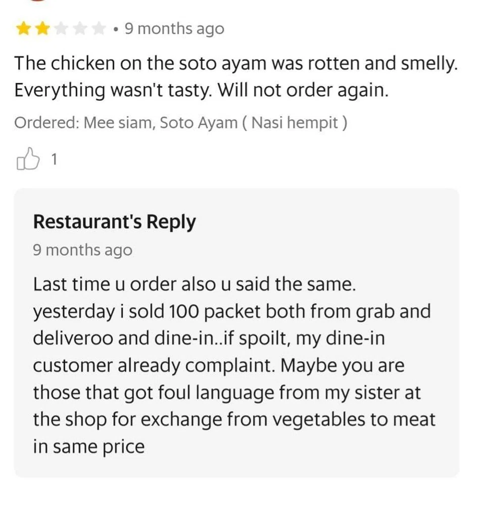 When another customer complained that the soto ayam was 'rotten and smelly', the stall countered that they remembered that particular reviewer had written something similar before.