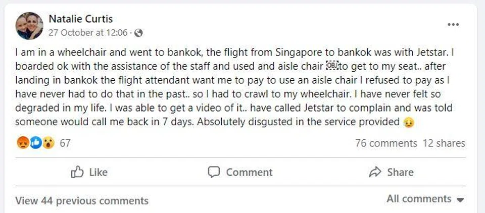 In September, a paraplegic passenger had to crawl across the cabin to get to his wheelchair on an AirAsia flight, after being asked to pay S$40 for an aisle wheelchair.