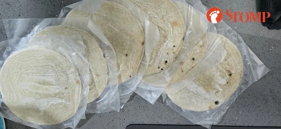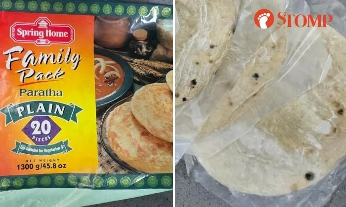 Stomper Mandy shared photos of the uncooked prata from a Spring Home brand family pack of 20 pieces on April 14. Greenish black spots can be seen on several pieces.