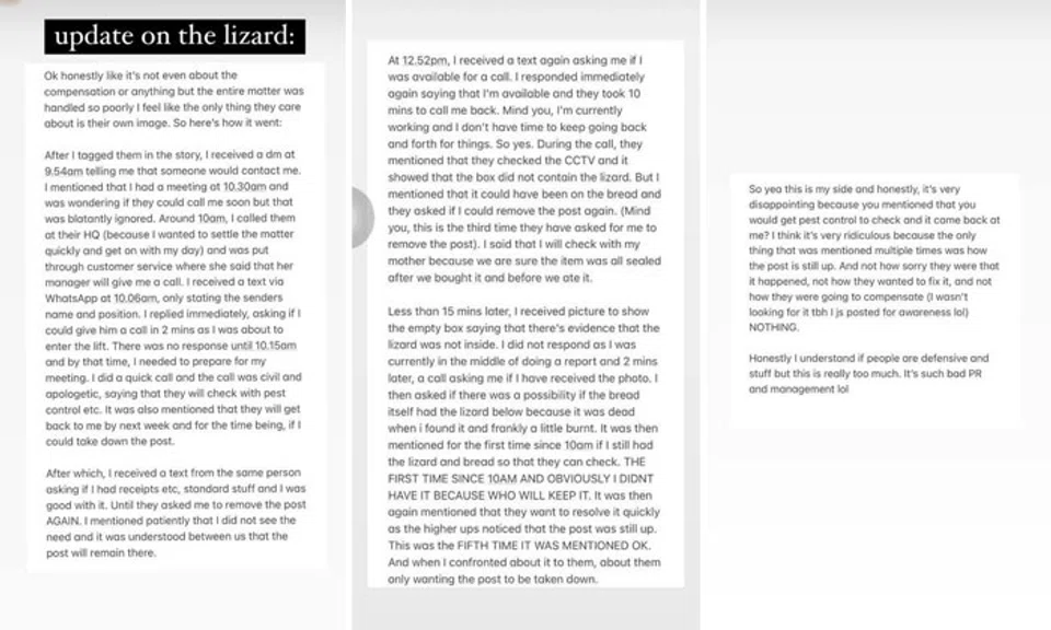 Stomp was alerted to a series of Instagram Stories posted by the customer who found the lizard that have been circulating on social media.