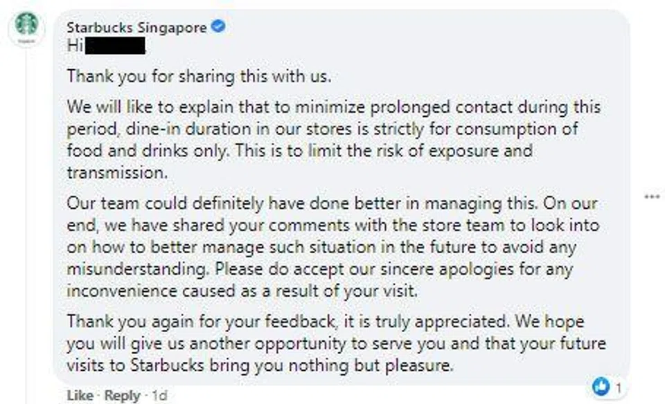 Starbucks responded to the netizen's complaint and explained that the dine-in duration in their stores is strictly for consumption of food and drinks only to minimise prolonged contact during this period.