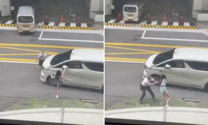 In the video, which appears to be taken from an upper floor of a nearby building, the woman is first seen shouting and gesticulating at the man from the pavement while he is in his car, a white MPV.