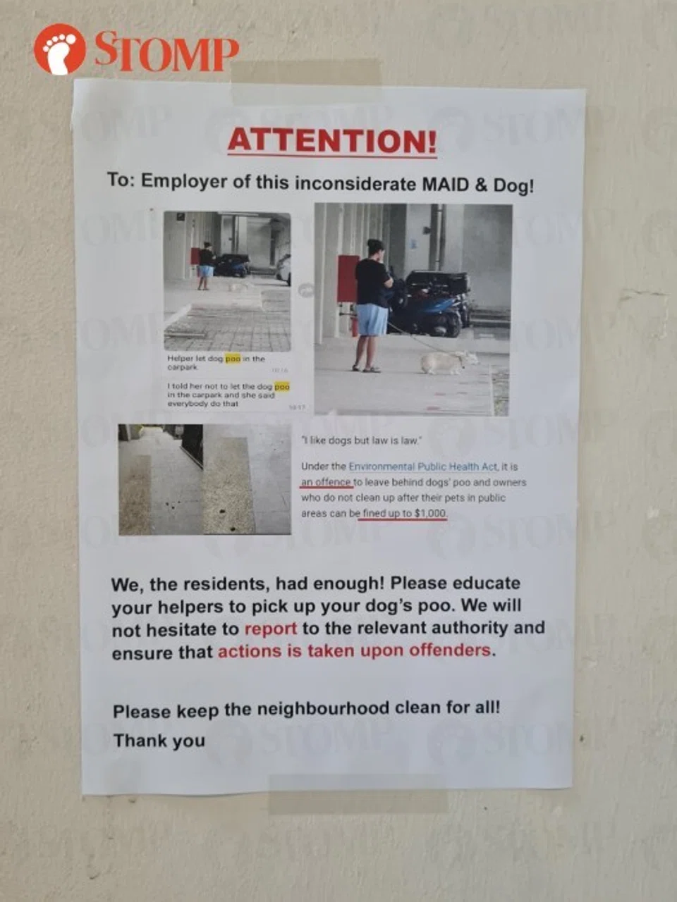 "This maid lets the dog poo and does not pick up the poo. When approached by one of the residents, she replied that everyone also does that," the Stomper added.
