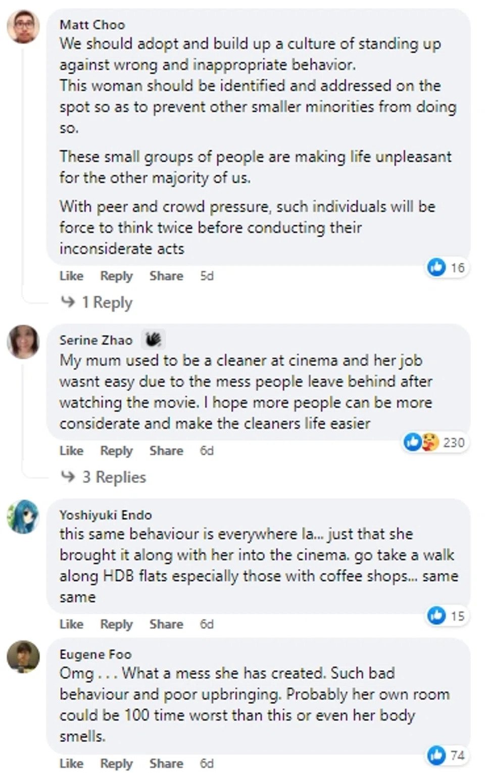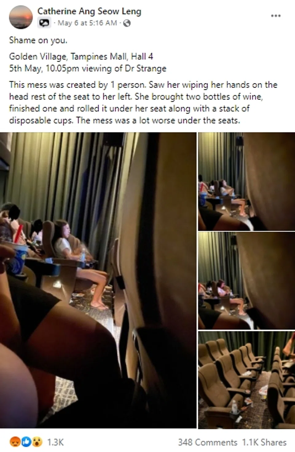 A woman has been called out for leaving a mess at Golden Village Tampines on May 5.