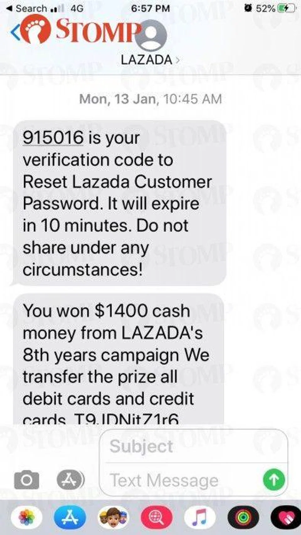 At 10.46am, H received a message from Lazada regarding a verification code that was meant to reset her "Lazada Customer Password".