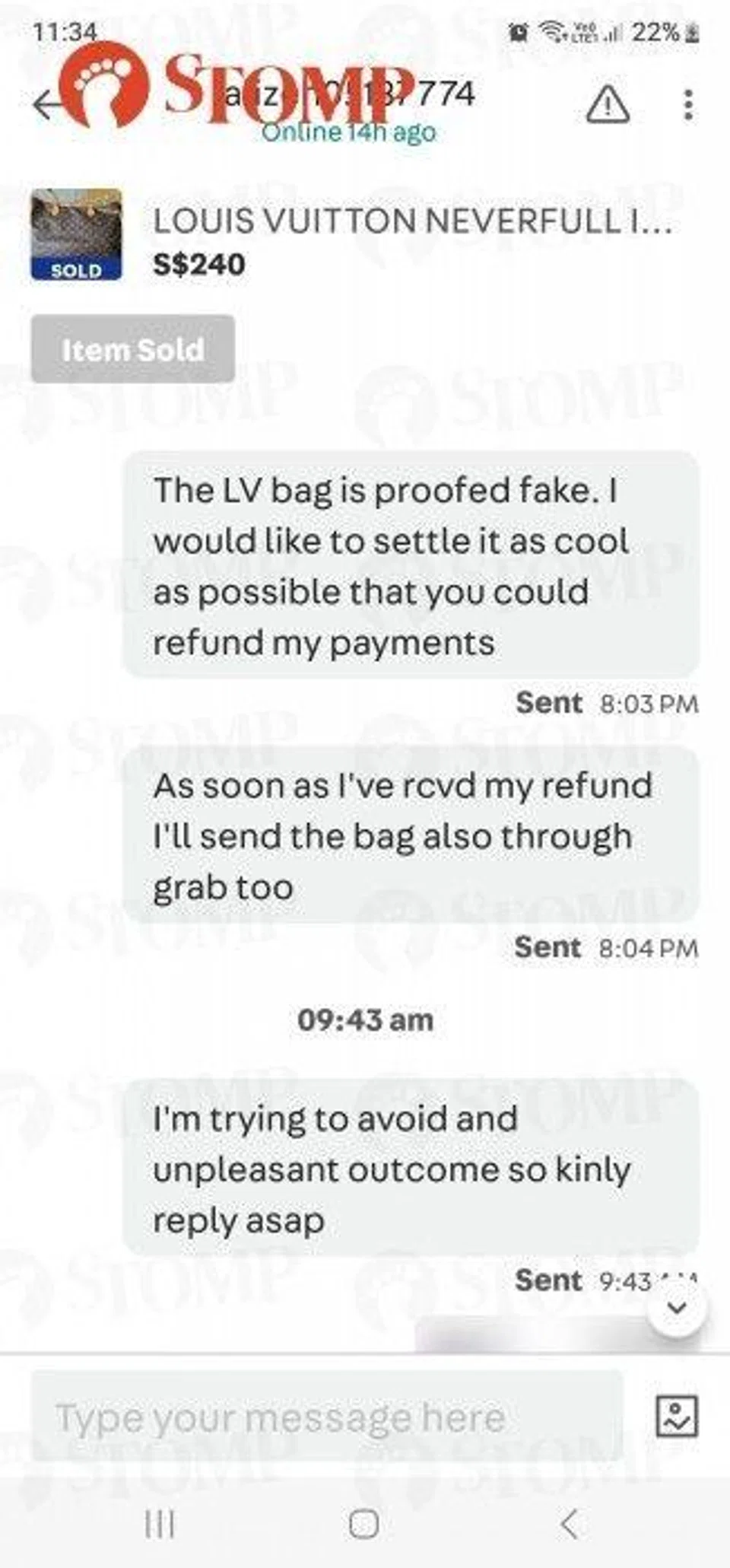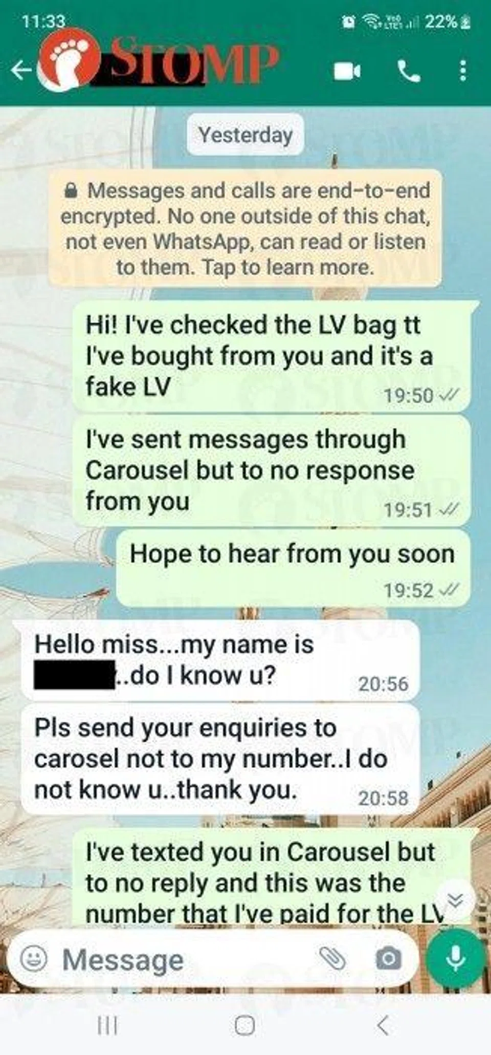 When she confronted the seller on the authenticity of the handbag and demanded a refund, the seller stopped replying.