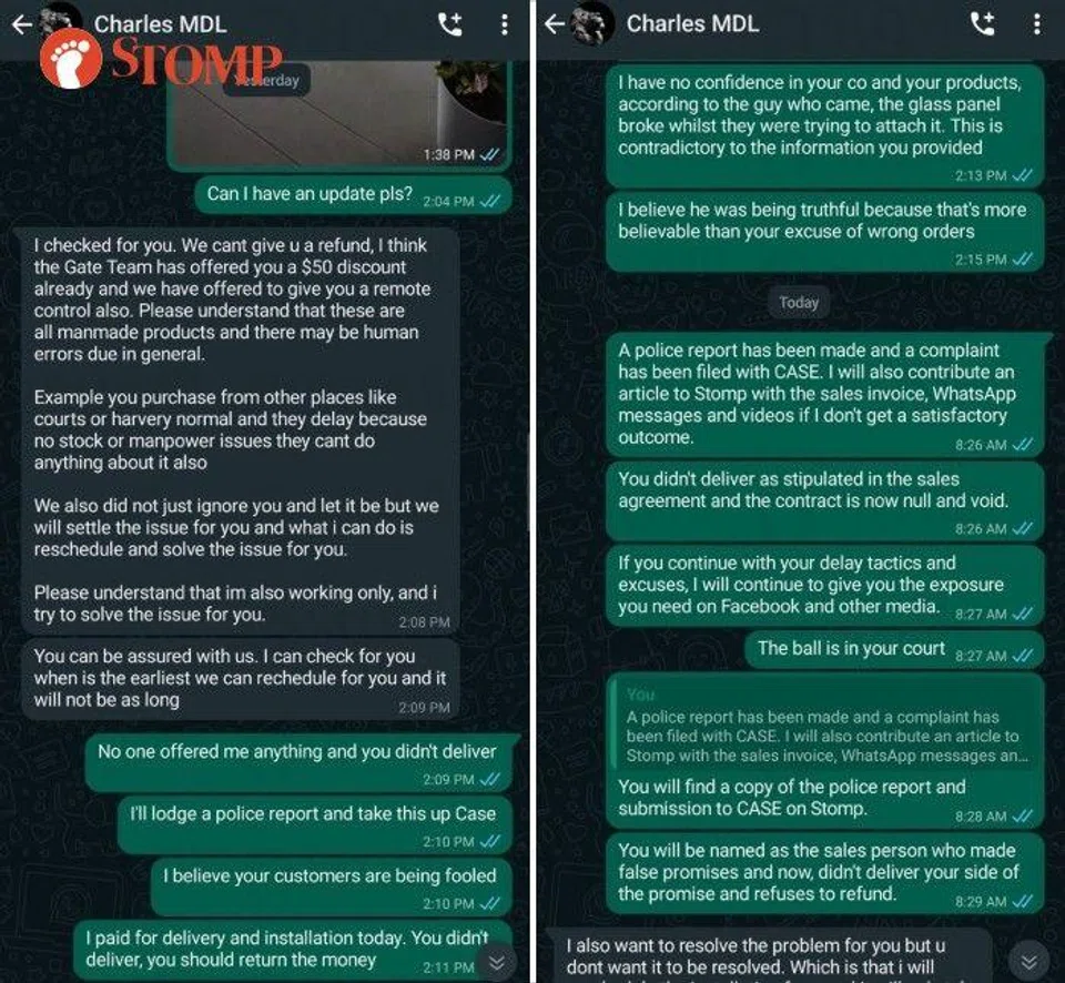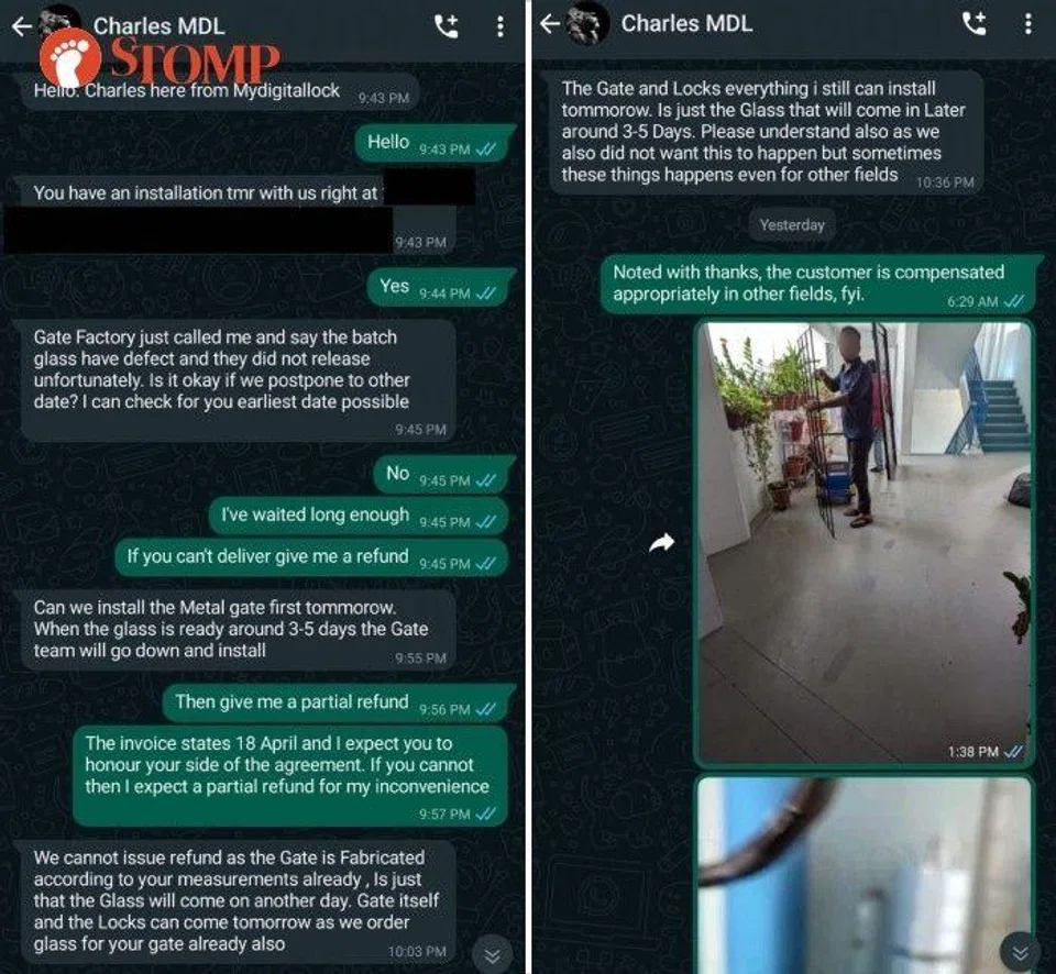 "At about 10pm on April 17, Charles got in touch with me via WhatsApp to inform me that there was a problem with the glass panels of the gate and that they were defective. As a result, he advised that they would install the metal gate frame and the smart locks on April 18 as agreed with the glass panels to be fitted after three to five days.