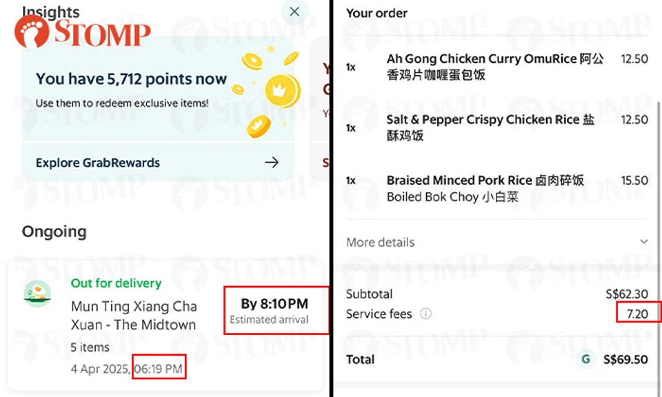 Stomper Kimberly had ordered $62.30 worth of food from Mun Ting Xiang in The Midtown at Upper Serangoon Road, a kilometre away from her home. She was also charged an additional service fee of $7.20.