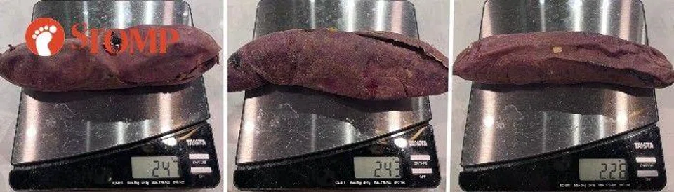 To compare, Stomp bought three baked sweet potatoes from the Don Don Donki outlet in Orchard Central for $2.90 each and weighed them.