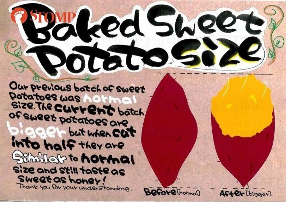 She also shared a photo of a Don Don Donki sign that said: "Our previous batch of sweet potatoes was normal size. The current batch of sweet potatoes are bigger, but when cut into half, they are similar to normal size and still taste as sweet as honey! Thank you for your understanding."