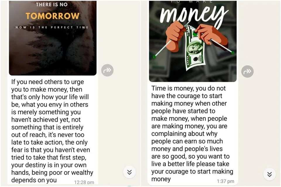 Over several months, the scammer "Charles Khoo" would send encouraging messages to Ms Lee daily. PHOTO: COURTESY OF MS LEE
