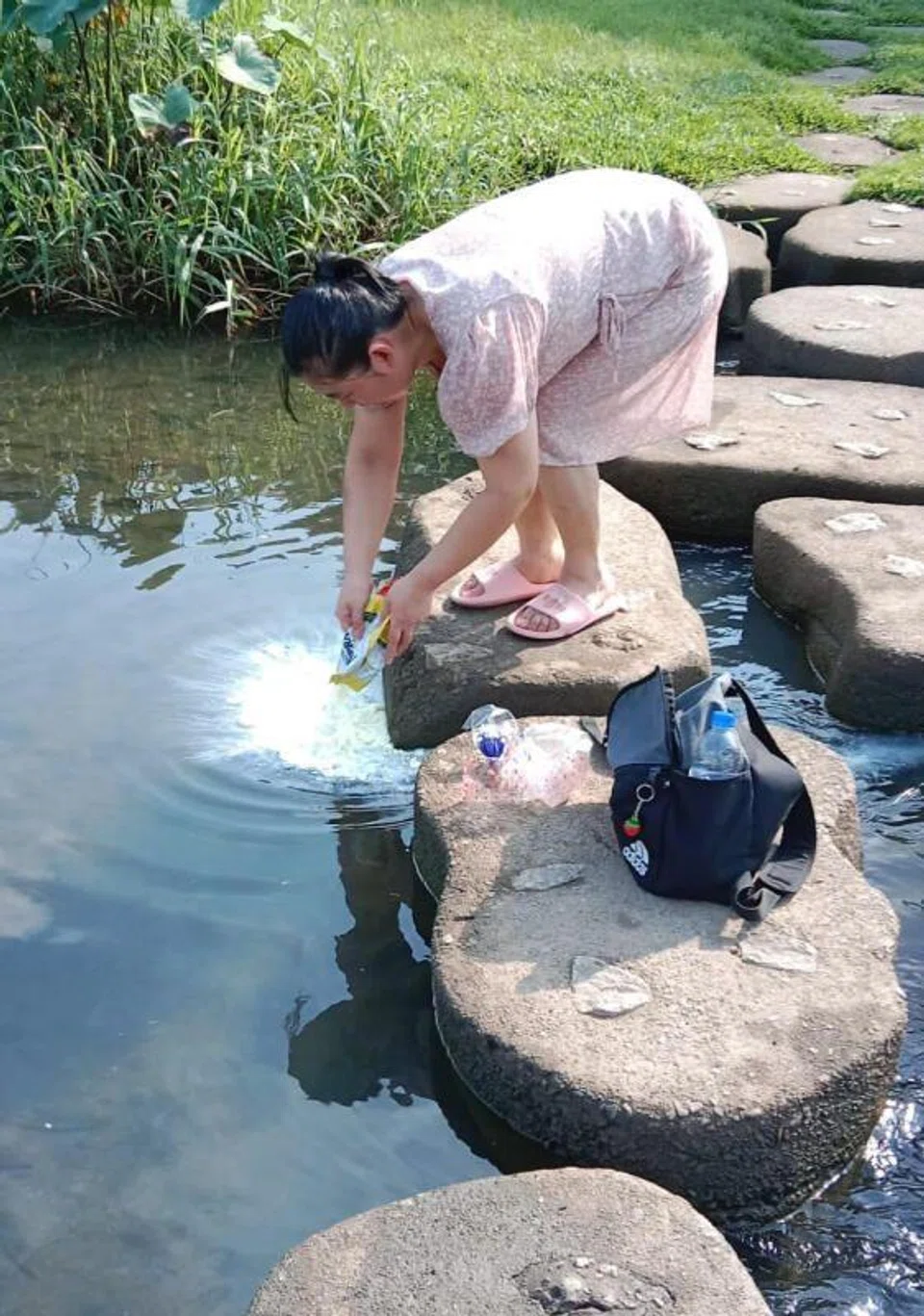 When Ms Hu tried again to persuade the woman to stop, she allegedly told Ms Hu that the milk powder had expired before emptying the contents of the packet into the pond.