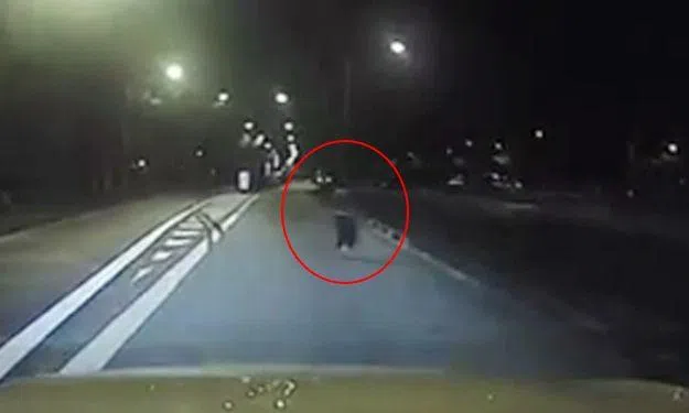 A video, posted by Roads.sg on Facebook and credited to Leon Peh, shows a woman running across the road in the dark and late at night.