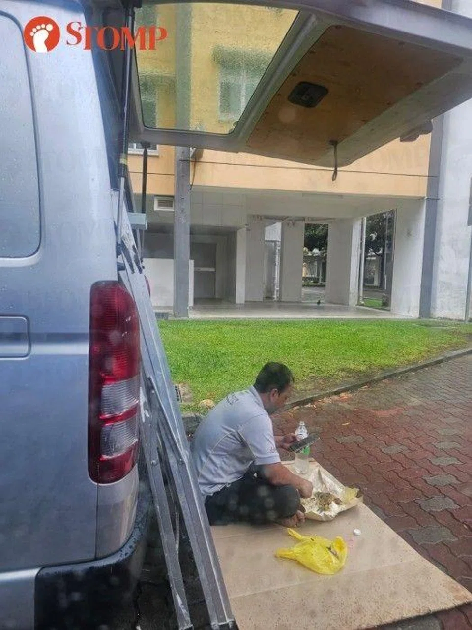 Stomper Anna shared a photo of the worker sitting on cardboard behind a parked van under its open rear door to shelter from the rain near Block 106A Canberra Road.
