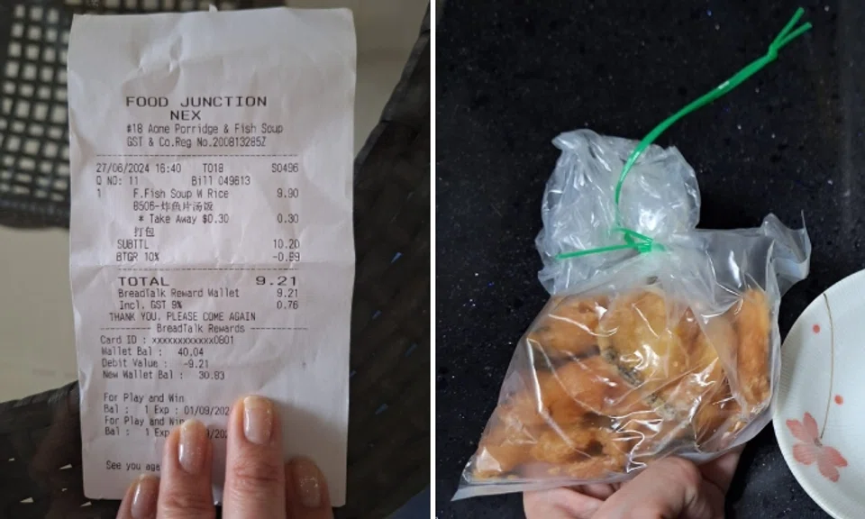 Woman says $9.21 for fried fish soup with rice from Nex not worth it, fish slices 'thin as chopstick'