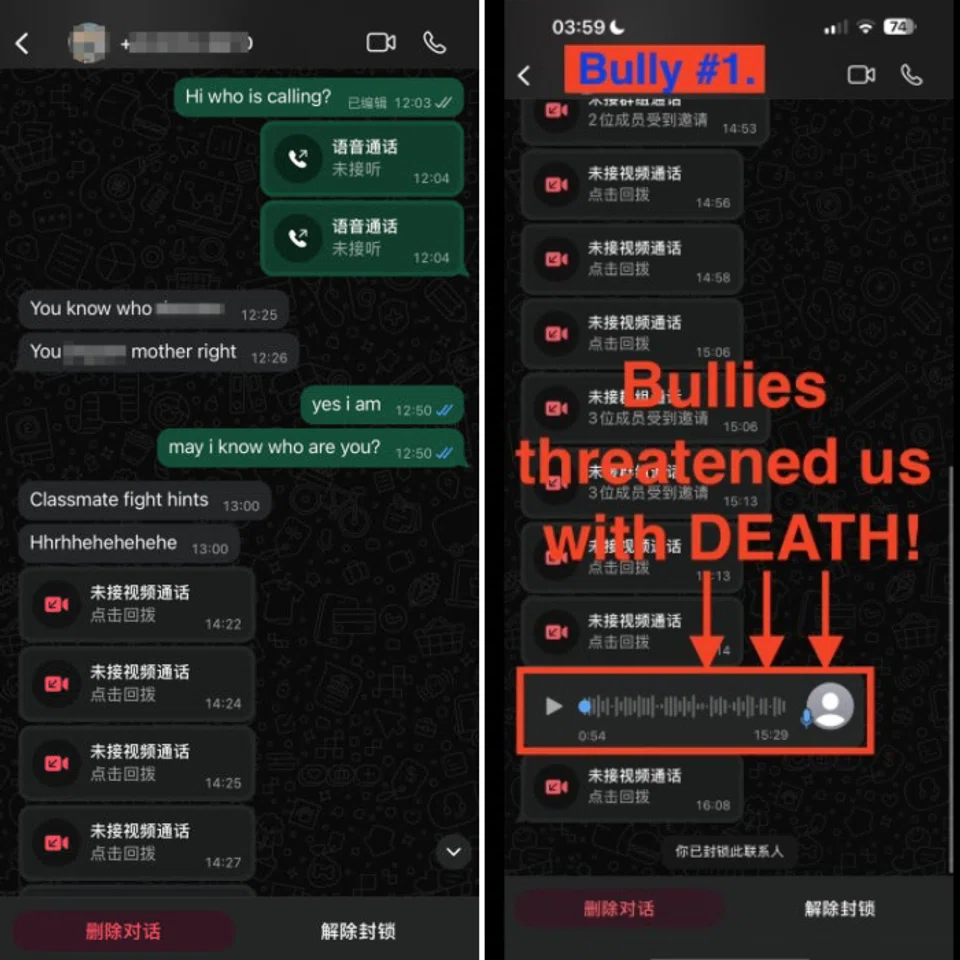 One caller allegedly identified her as the girl's mother before sending voice messages containing death threats - which she claims came from one of the boys accused of bullying.