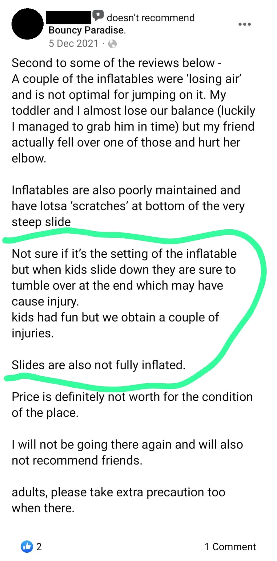 "I highlighted the safety lapses in their inflatable playground and that the slide I took was too steep and too dangerous.