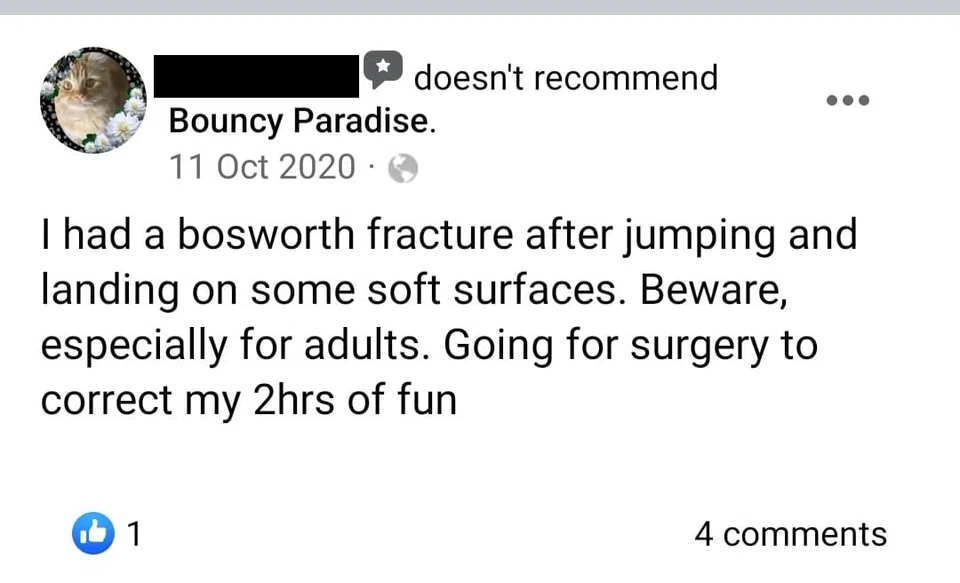 "I did a check on their Facebook reviews and I was surprised I was not the only one who suffered injuries and there are others also complaining about their safety," she said.