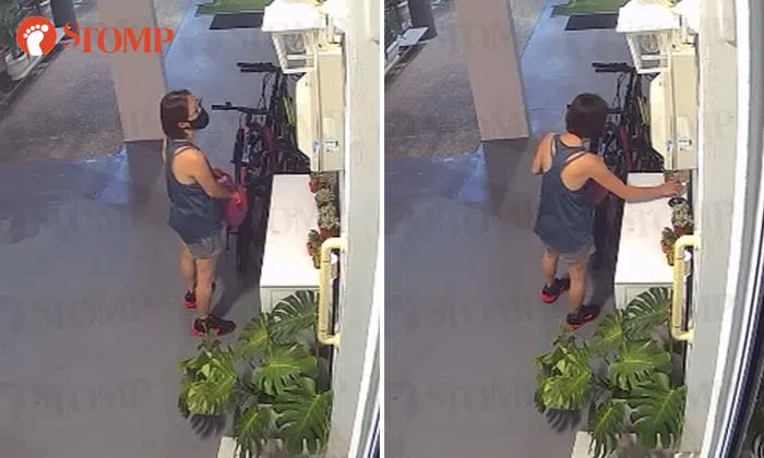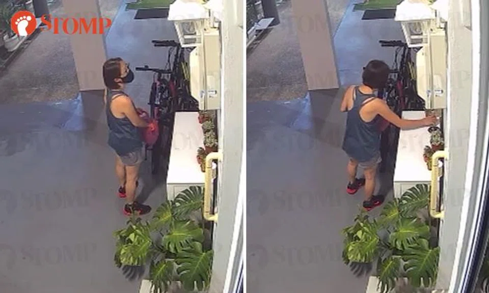 A woman was caught on camera taking not one but five tiny potted plants from outside a Simei resident's home.