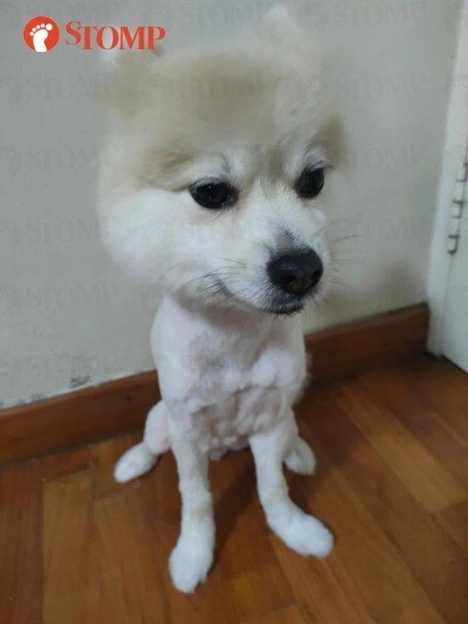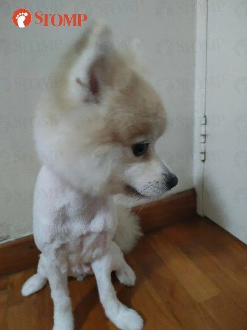 "But look at our Pomeranian now. Pictures speak a thousand words! My dog is shivering all the time as it has no more fur left. It's in shock and refusing to play. It was actually sitting in one corner behind the door that whole day after the grooming."