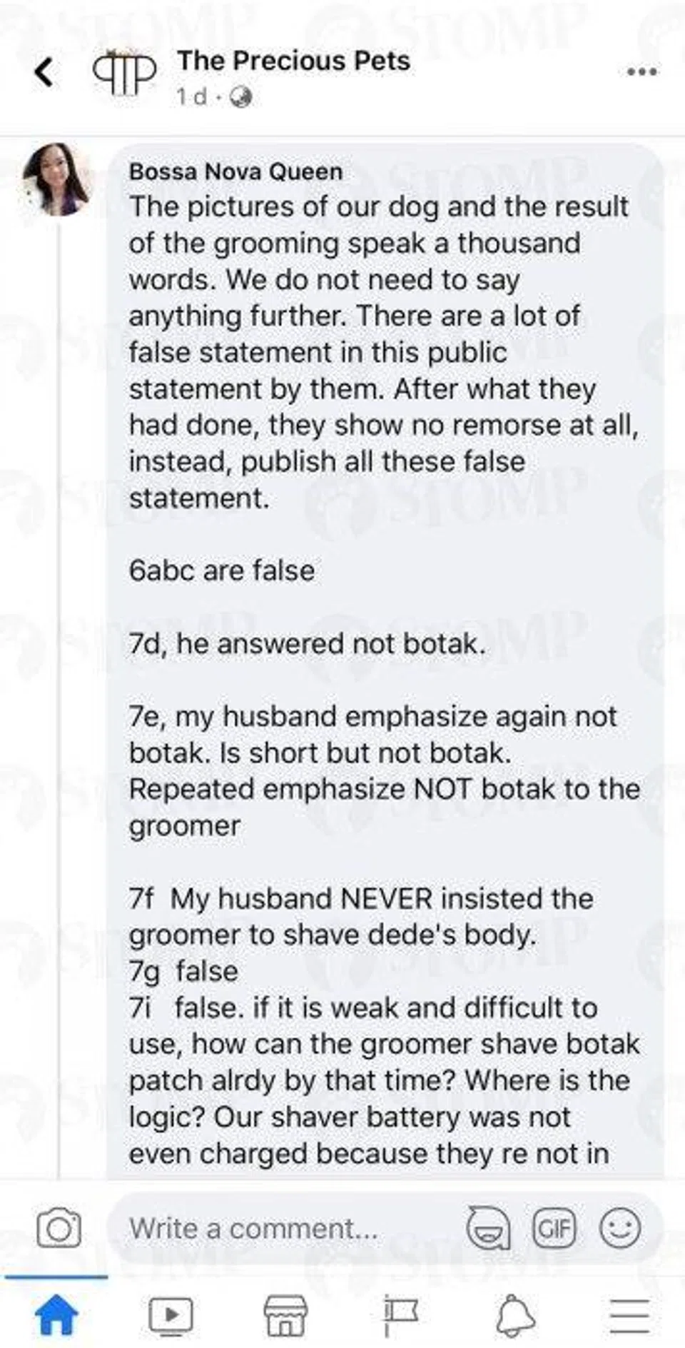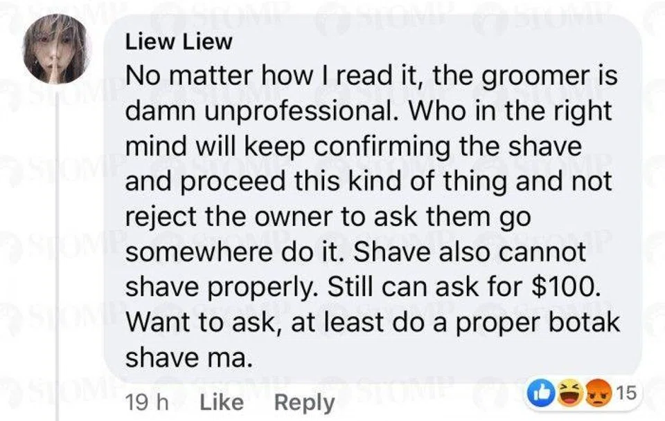 In response to a Stomp query, Sylvester Tan, the boss of The Precious Pets, said: "From our perspective, our groomer had done all that she could under the circumstances to meet the customer’s and the customer’s husband’s requests.
