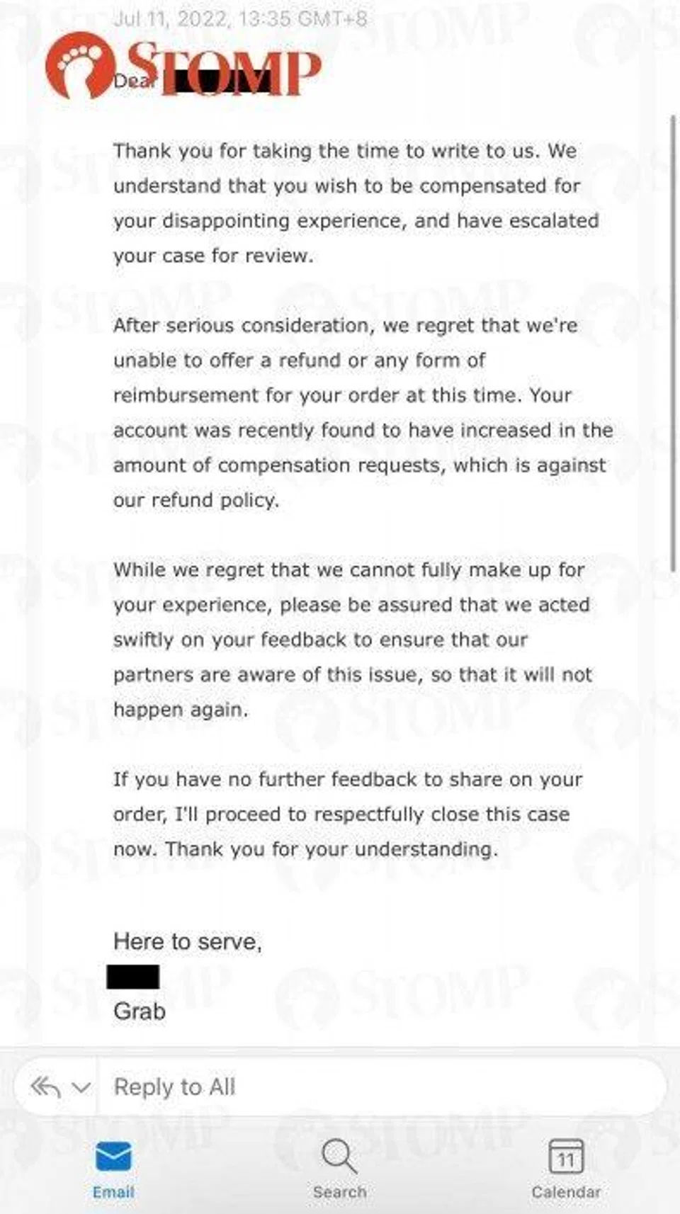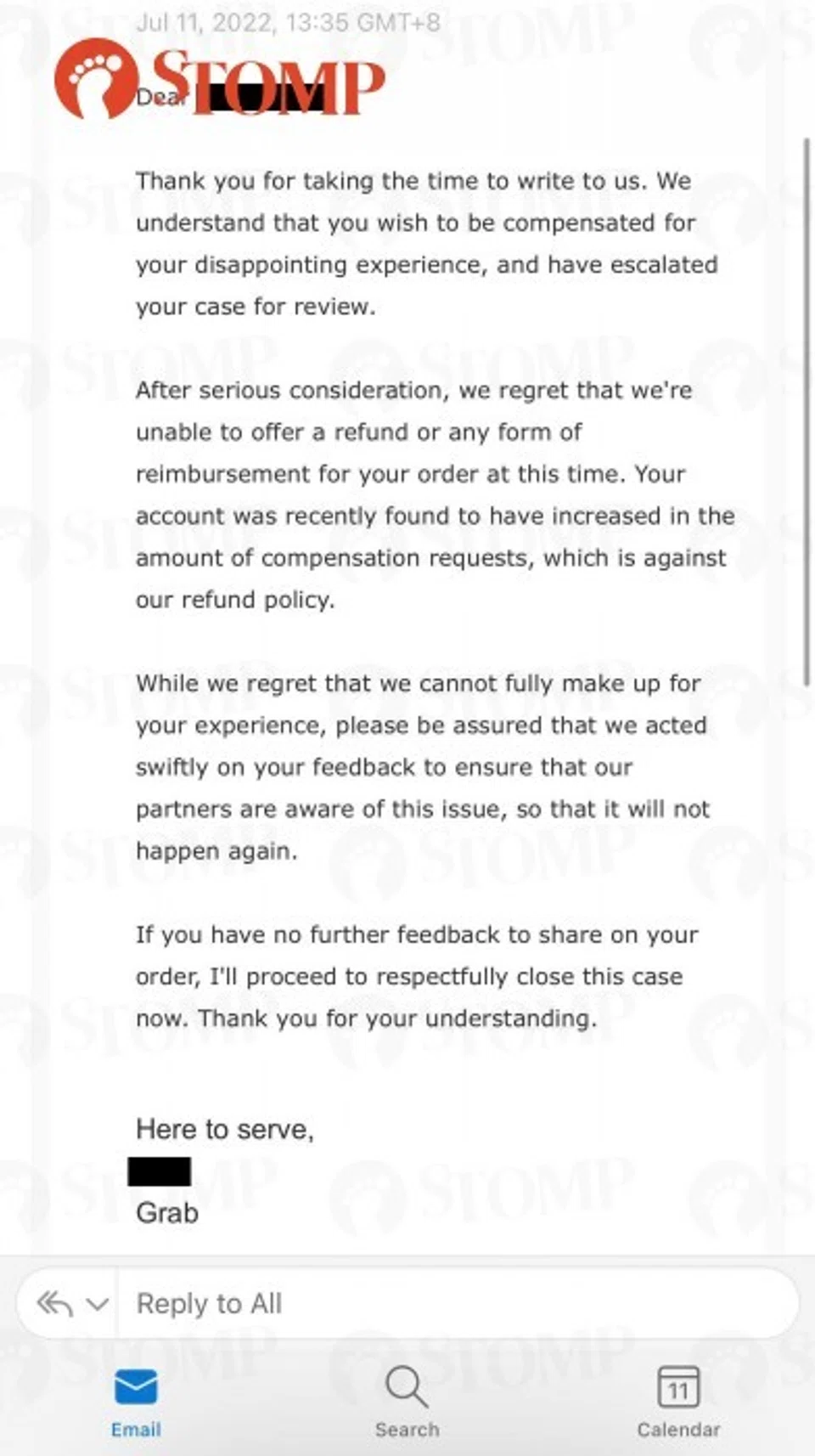 The response stated that GrabFood is unable to offer a refund or any form of reimbursement as May's account "was recently found to have increased in the number of compensation requests", which is against the platform's refund policy.