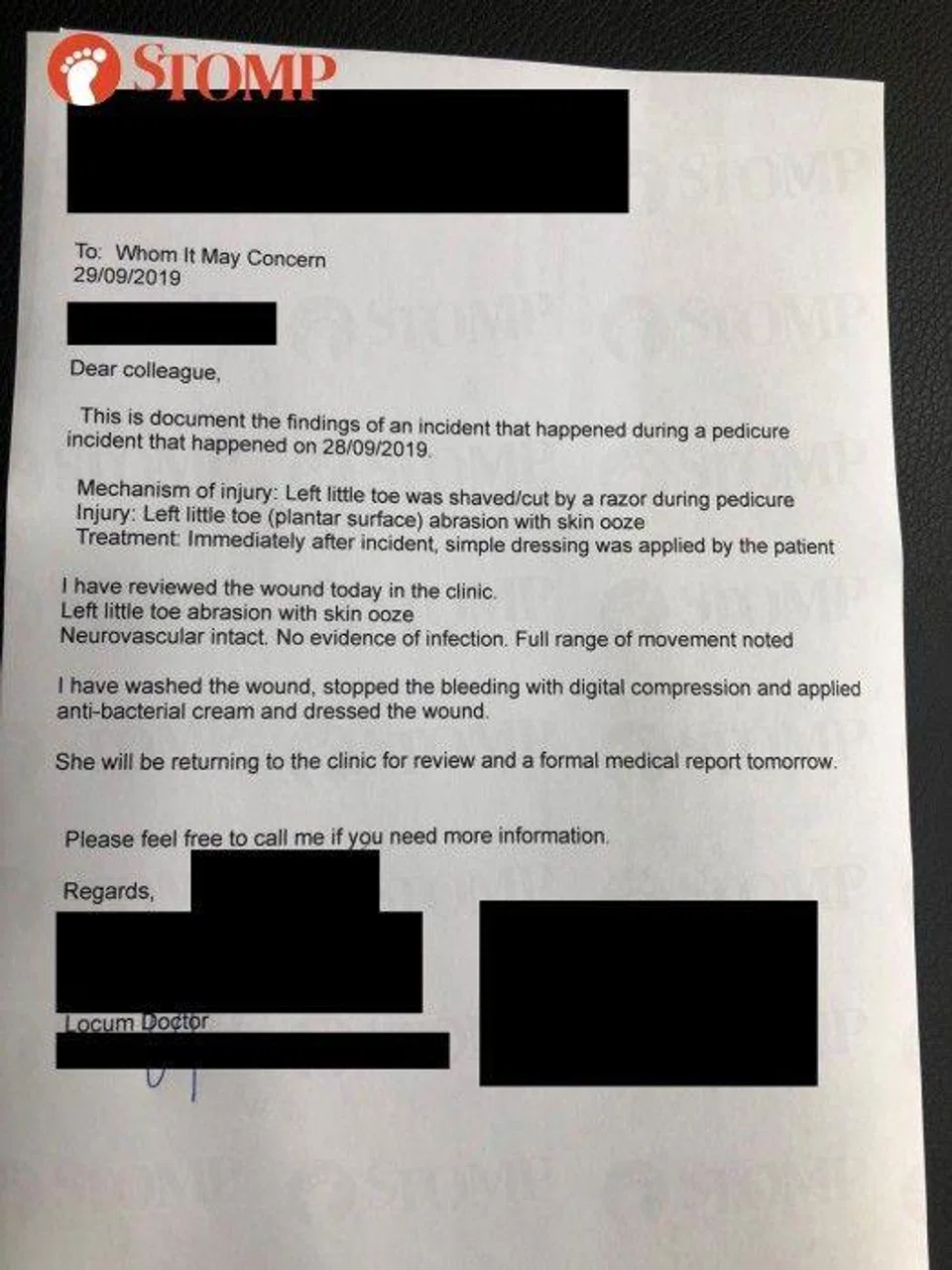 She also shared with Stomp a medical letter she got from the doctor.