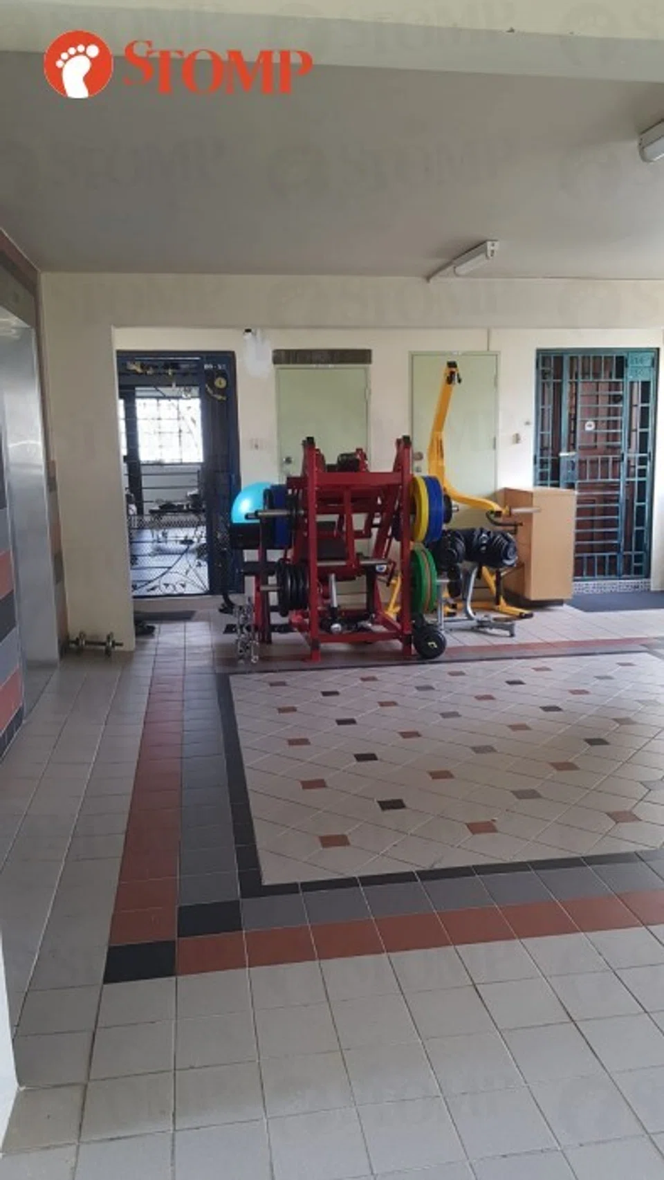 In the photo, the gym equipment can be seen taking up a large space at the lift lobby.