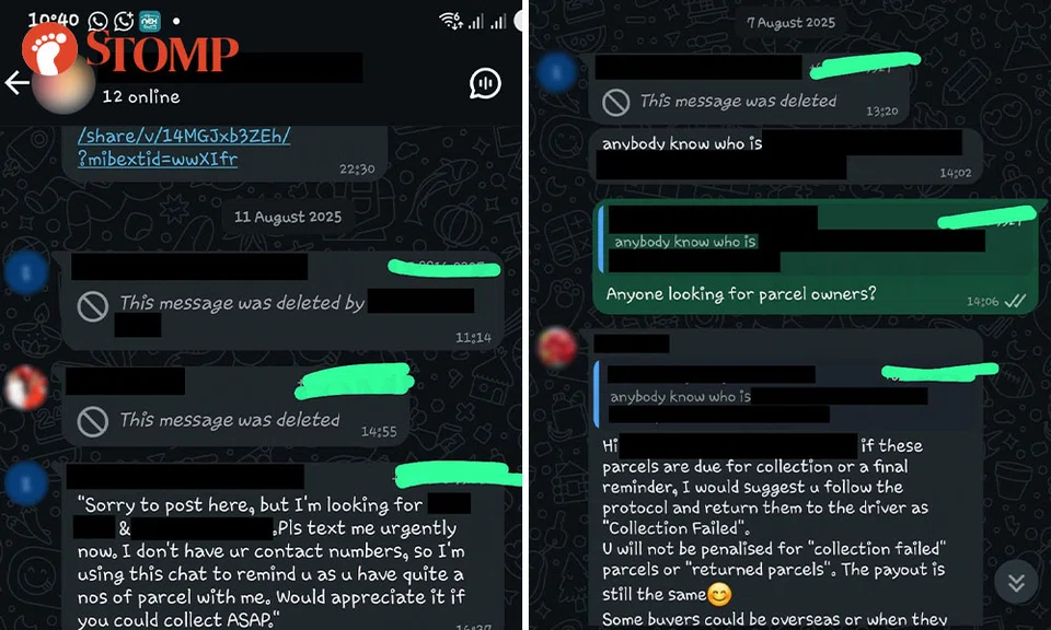 She sent Stomp screenshots of the estate's group chat in which the collection point owner posts messages looking for parcel recipients.