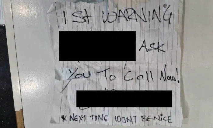 A debtor’s note was found outside the unit. It said: "1st warning. (Redacted) ask you to call now! Next time won't be nice."