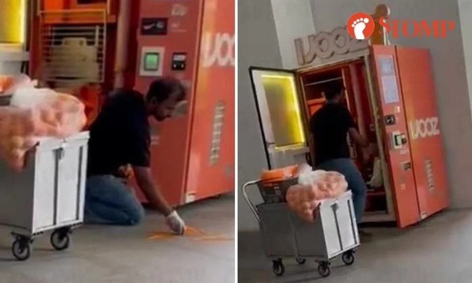 A worker was caught on camera picking up spilled straws from the floor and placing them in an iJooz vending machine at a Queenstown condominium.