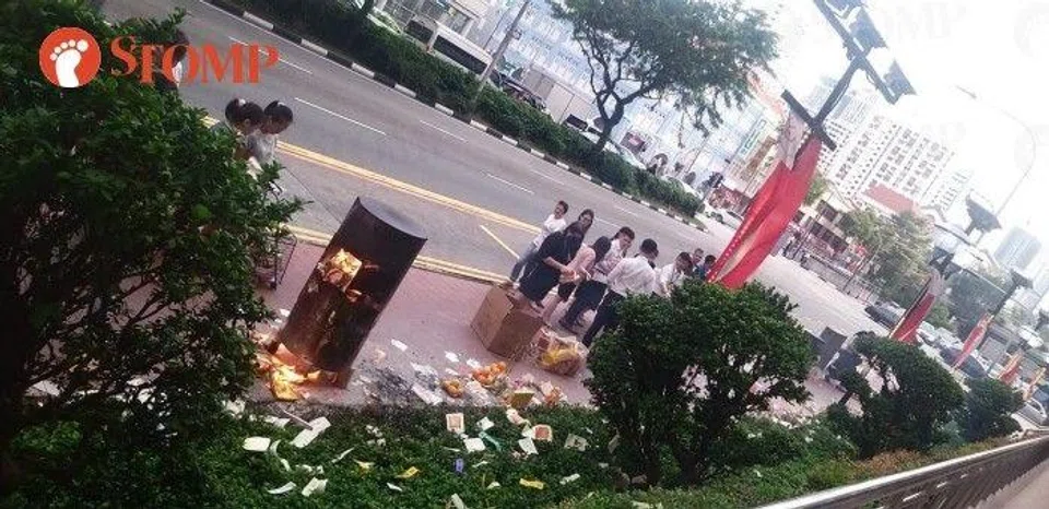 Stomper Anon shared photos of a group of people burning offerings on the side of Eu Tong Seng Street on Aug 16 at around 6.30pm.