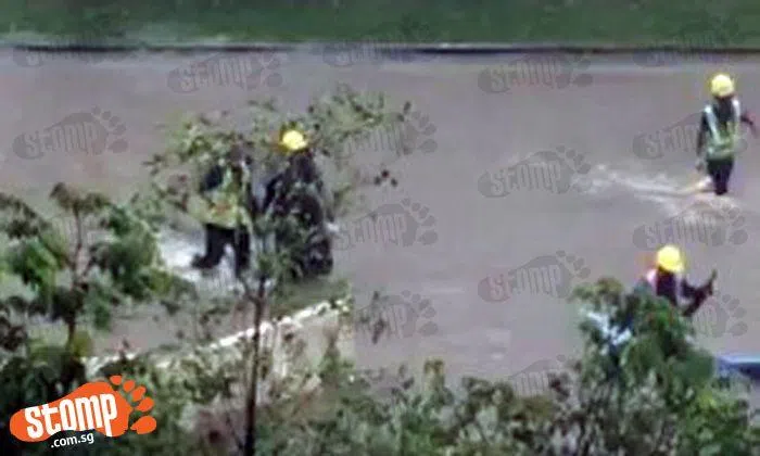 Workers wade through shin-deep water after heavy rain causes flood at Hougang