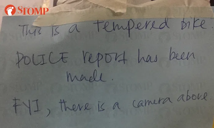 Part of the note reads, "FYI, there is a camera above," meaning that CCTV footage of anyone tampering with the bikes might have been captured.