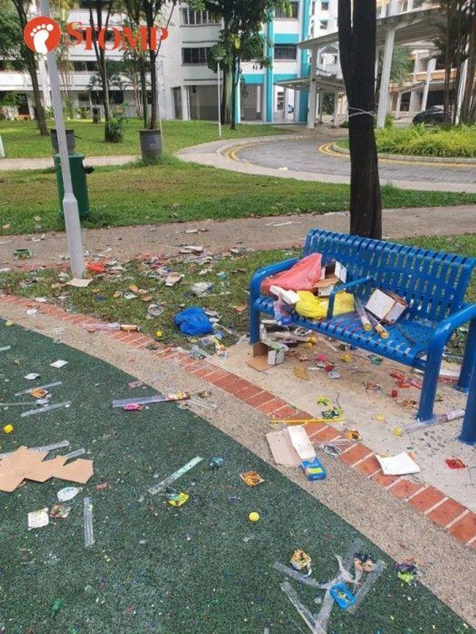 A group of youths celebrating Deepavali startled passers-by with bomb bags and left behind a mess of litter at Kaki Bukit Neighbourhood Park in Bedok North Street 3 on Oct 23.